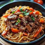 Schnelle Reisnudeln mit zartem Rindfleisch und knackigem Gemüse in Sojasauce und Sesamöl. Ein einfacher, asiatischer Genuss.